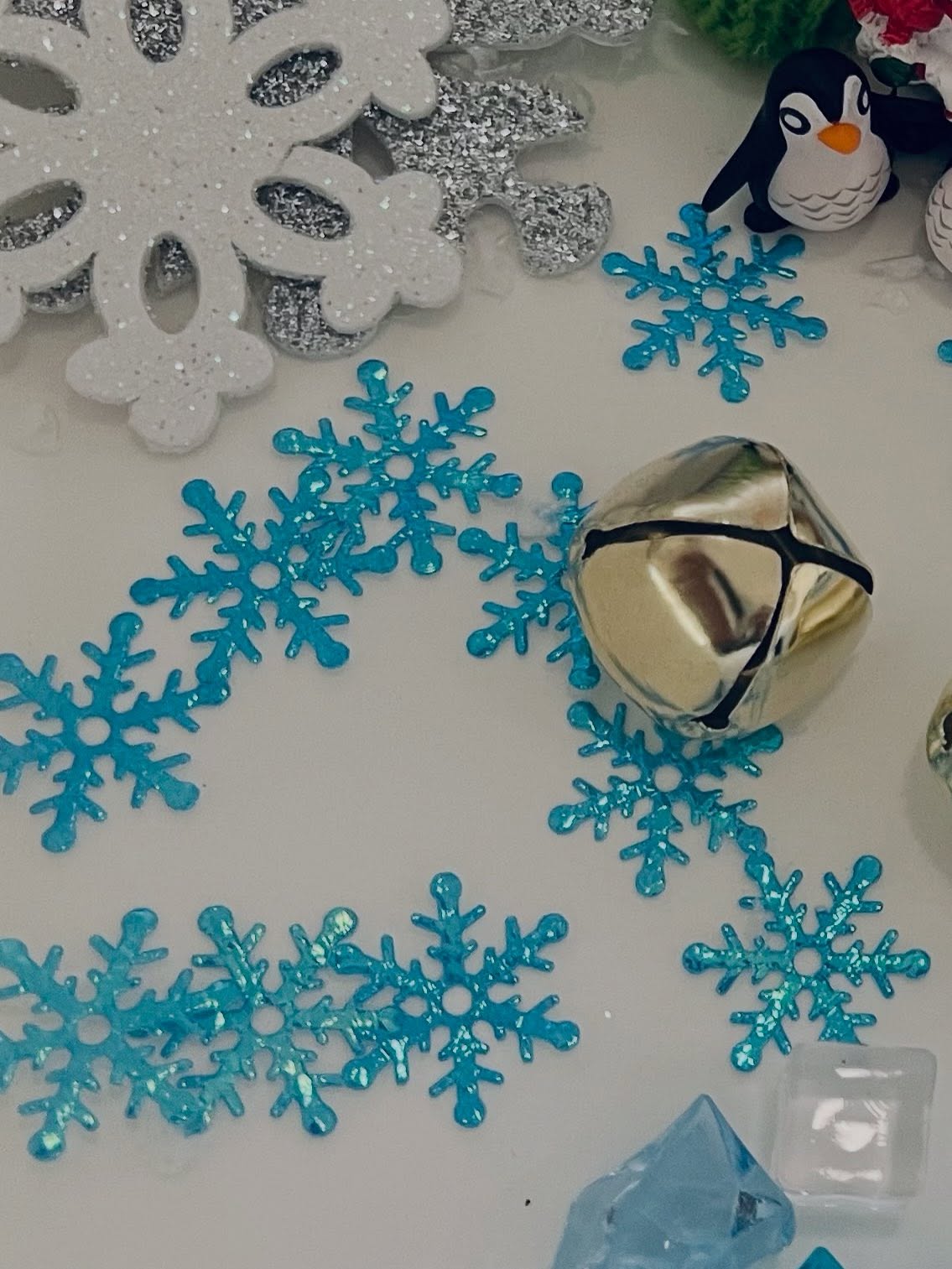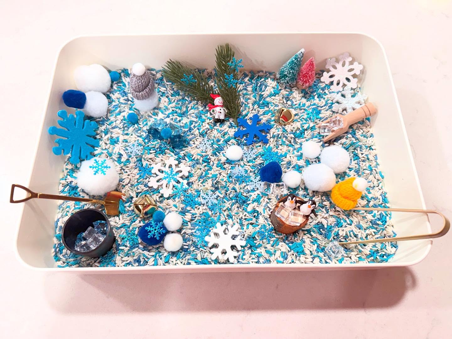 A soothing winter sensory bin filled with soft whites, gentle blues, and cozy textures—perfect for calm, imaginative play on chilly days.
